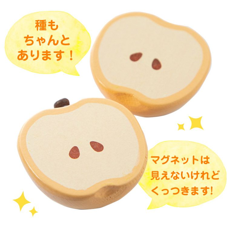 木の風合いを活かしながら、食材のなめらかな形や質感を再現。小さな手でも持ちやすい大きさで、優しく丸みのある形に仕上げています。 食材の断面は、実物を思わせるリアルなデザインで、お子さまの好奇心を刺激し、実物への関心を促します。
