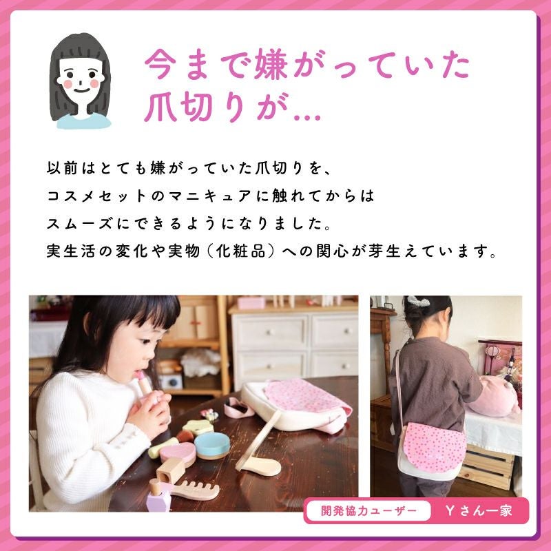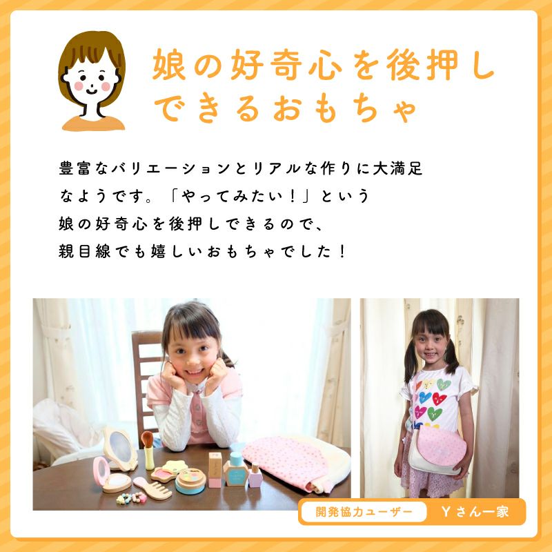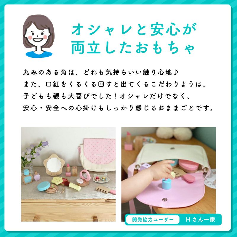 木の風合いを活かしながら、食材のなめらかな形や質感を再現。小さな手でも持ちやすい大きさで、優しく丸みのある形に仕上げています。 食材の断面は、実物を思わせるリアルなデザインで、お子さまの好奇心を刺激し、実物への関心を促します。